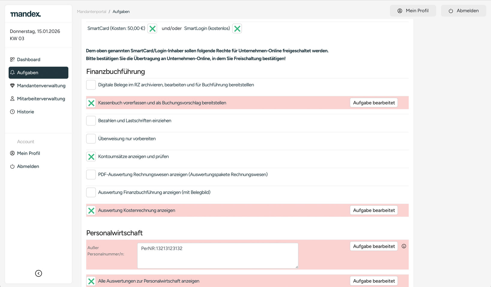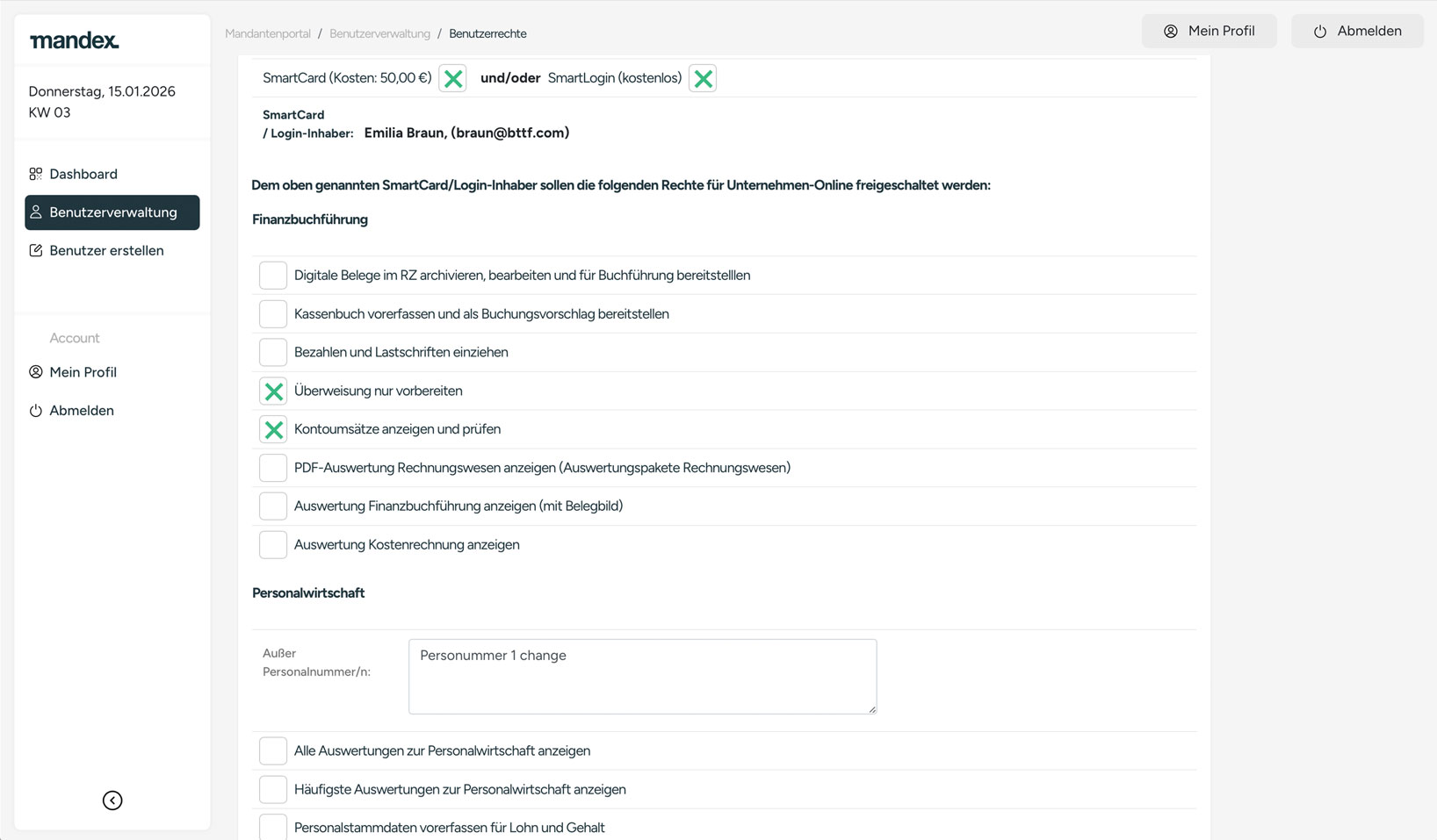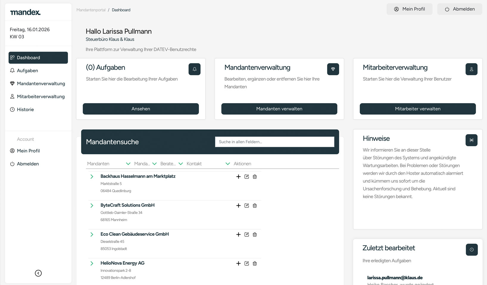 mandex ergänzt DATEV-Unternehmen online um einen klaren, transparenten und effizienten Prozess rund um die Benutzerrechteverwaltung. Eine direkte technische Schnittstelle zu DATEV besteht dabei nicht; die Übertragung erfolgt weiterhin durch die Kanzlei. Der deutliche Zeit- und Kostenvorteil entsteht durch die strukturierte Vorbereitung, Nachvollziehbarkeit und Automatisierung des gesamten Ablaufs.
